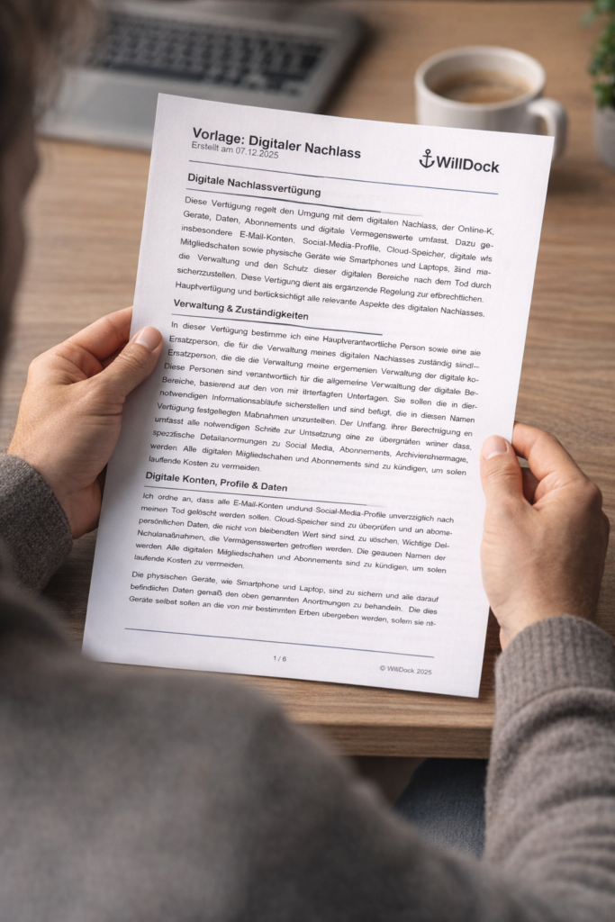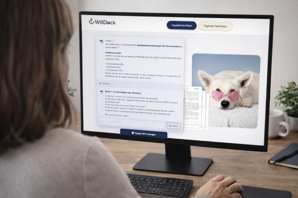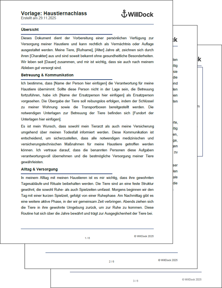 Laden Sie Ihr PDF herunter, unterschreiben Sie es und bewahren Sie es sicher auf. Für Standard-Fälle (wie z. B. den Haustier-Nachlass) ist keine notarielle Beglaubigung erforderlich. Bei komplexen Sonderfällen können Sie das Dokument einer Fachperson zeigen.